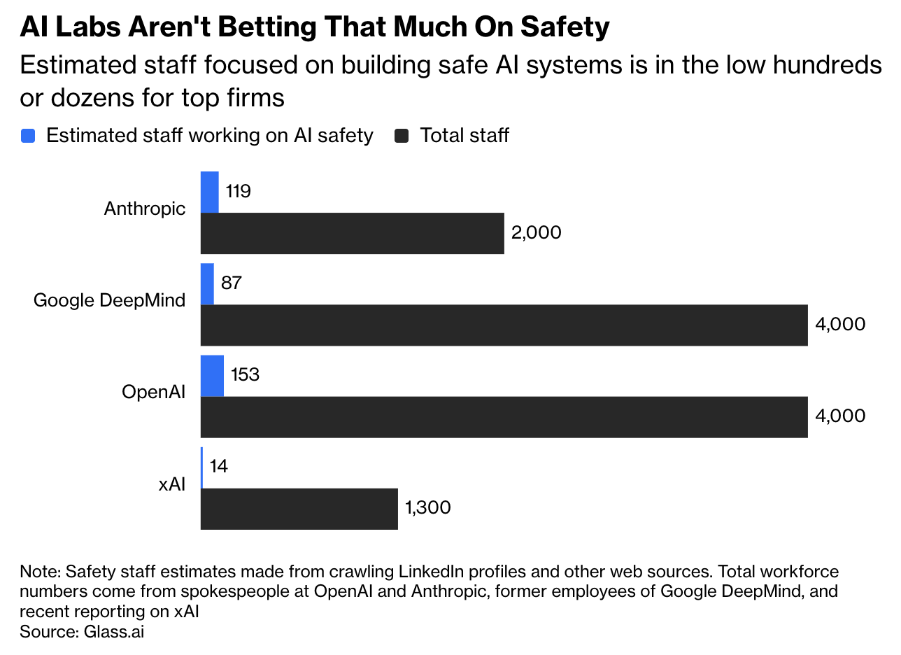 When the AI labs (OpenAI, Anthropic, Google DeepMind and xAI) declined to provide stats on their personnel, Bloomberg asked Glass.AI to investigate — which we did by deep reading LinkedIn profiles, company websites, news articles and other online sources to identify staff focused on safety-related work. That includes tasks like making sure the AI tools are