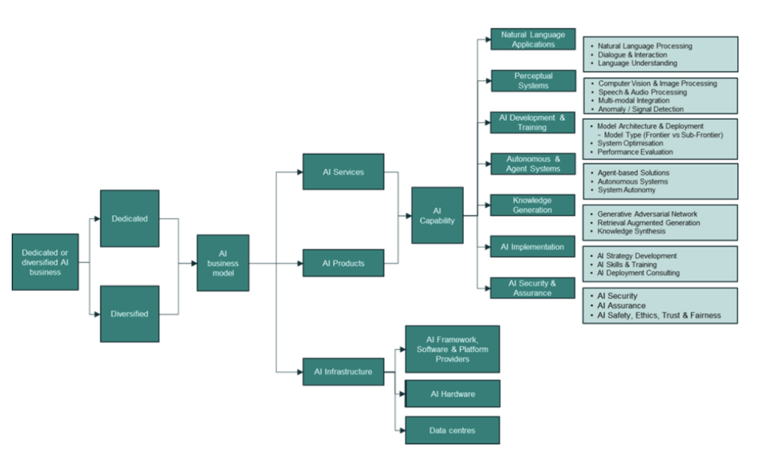 Like in previous studies, given that Standard Industrial Classification (SIC) codes do not yet include a specific ‘artificial intelligence’ classification, the analyses contained in this report were based on a business-focused taxonomy that can better reflect AI activity in the UK. The taxonomy used to describe AI activity in this study is illustrated below: